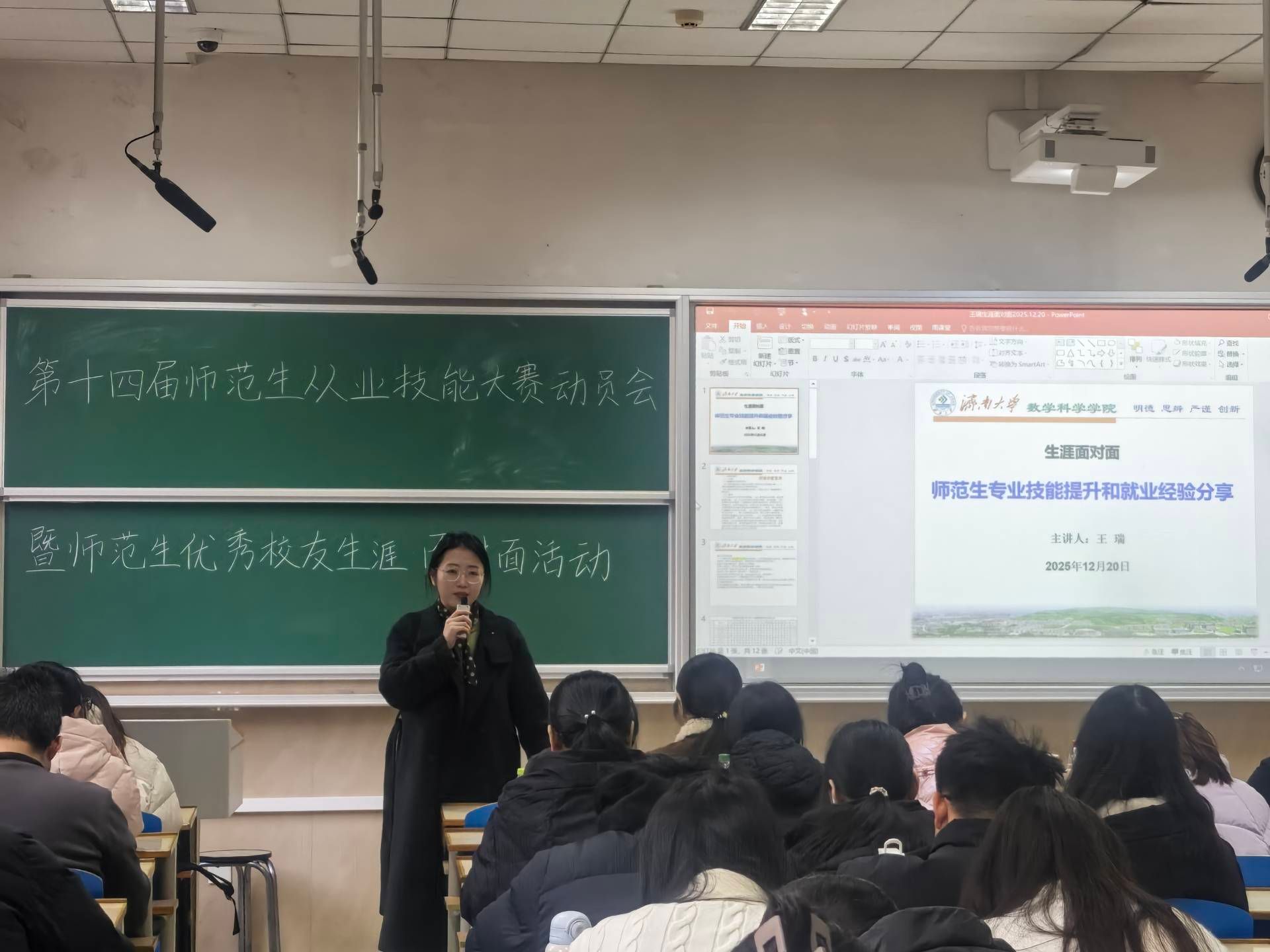 于12月20日在第一教学楼105教室开展优秀校友生涯面对面活动暨第十四届师范生从业技能大赛动员大会。学院党委副书记、副院长张沂红出席活动并做动员讲话,济南市第十一中学教师潘玮珊、山东师范大学附属小学教师王瑞作为优秀校友受邀分享实战经验,学院师范生积极参与。