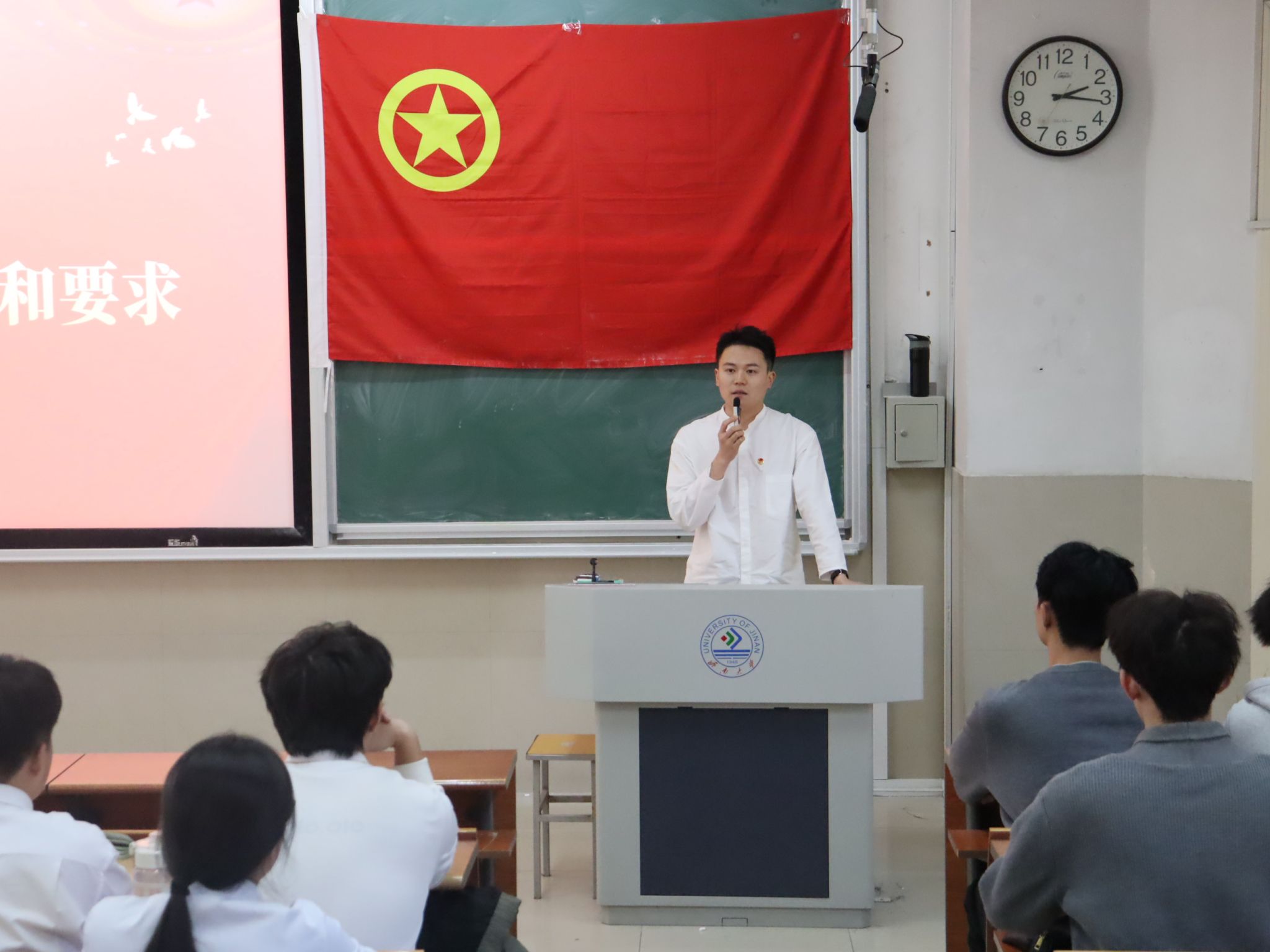 姬磊宣读了新团员名单,并为新团员佩戴团徽、颁发团员证。随后,在领誓人赵卓娅的带领下,新团员面向团旗庄严宣誓。