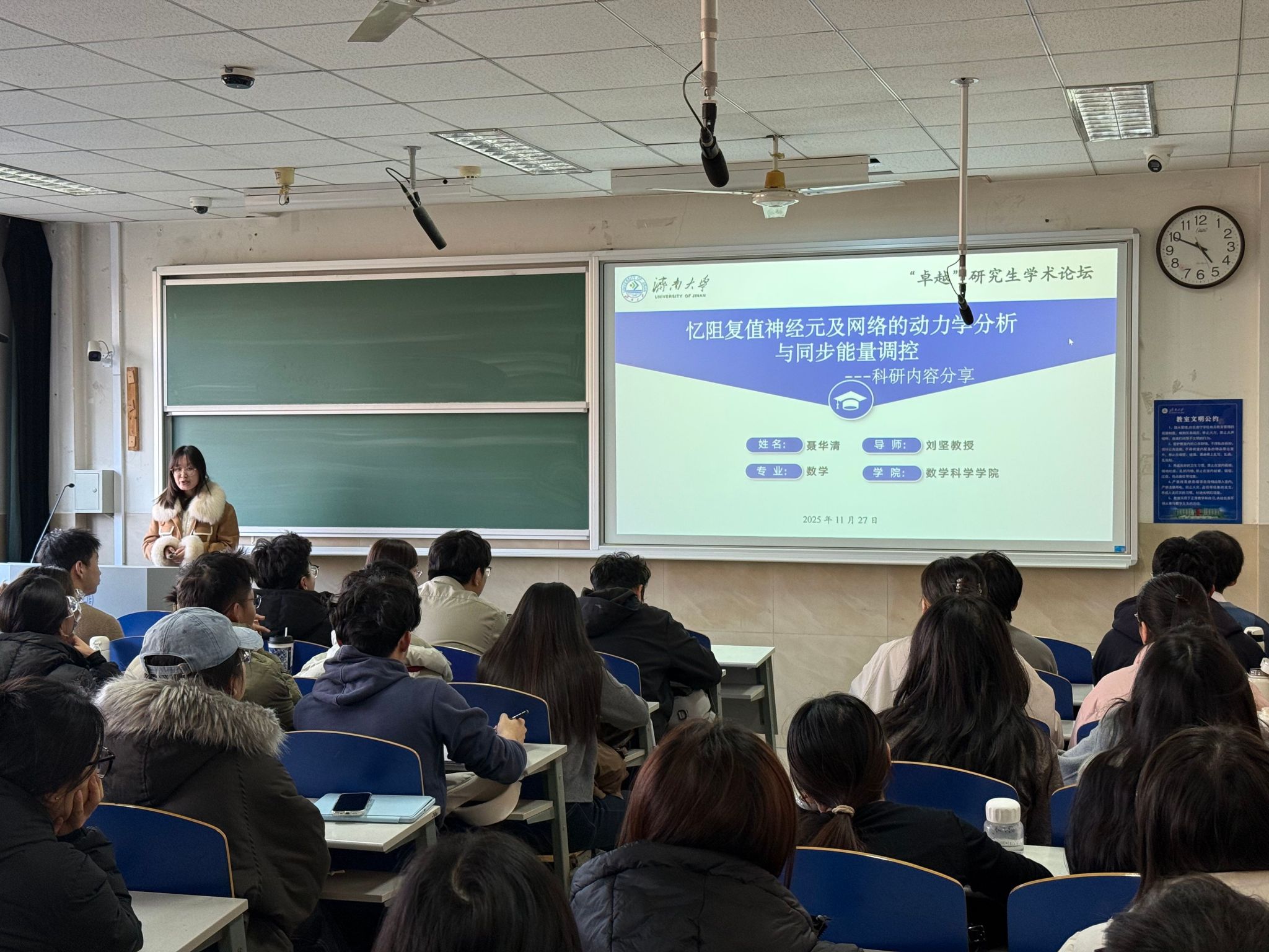 11月27日,成人论坛 “数海拾贝,薪火映途”研究生学术论坛暨2025年成人论坛 “卓越”研究生分论坛成功举办。本次论坛邀请国家奖学金获得者聂华清、张宪哲两位同学,分享了他们在研究生阶段开展科学研究的心得与经验,并为学弟学妹提供了宝贵建议。刘坚教授应邀出席,对两位同学的分享作了精彩点评,同时结合自身指导研究生的经历,与在场同学进行了深入交流。